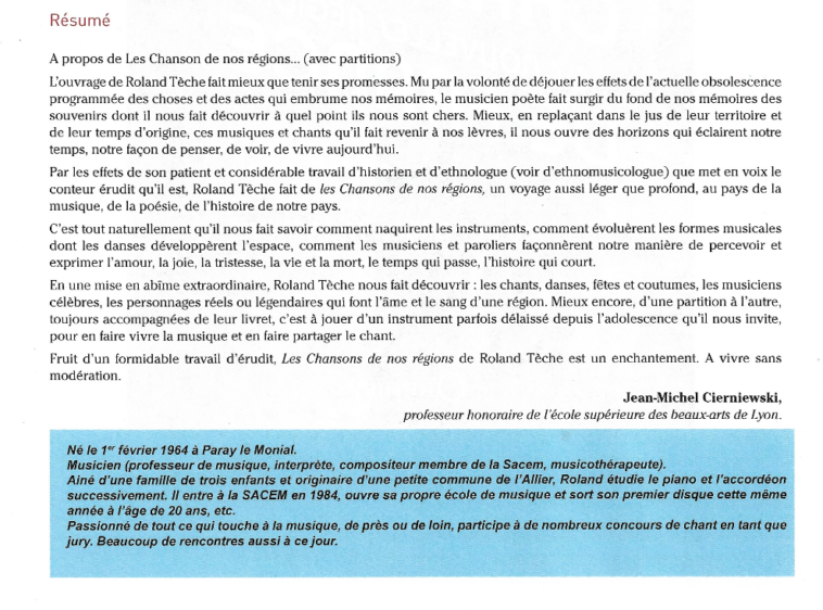 Roland Tèche nous convie à un voyage guidé dans l'univers de la Chanson de nos régions de France. Son propos sont fondé sur l'ouvrage qu'il a rédigé sur ce thème et dont nous vous proposons, ci-dessous, le texte du quatrième de couverture confié à la plume de Jean-Michel Cierniewski, professeur honoraire de l'école supérieure des beaux-arts de Lyon: tout y est dit.
